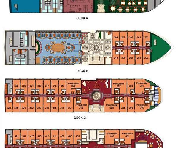 - Main dining room, sun deck bar, lounge, panoramic lounge, piano bar